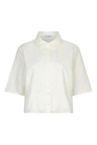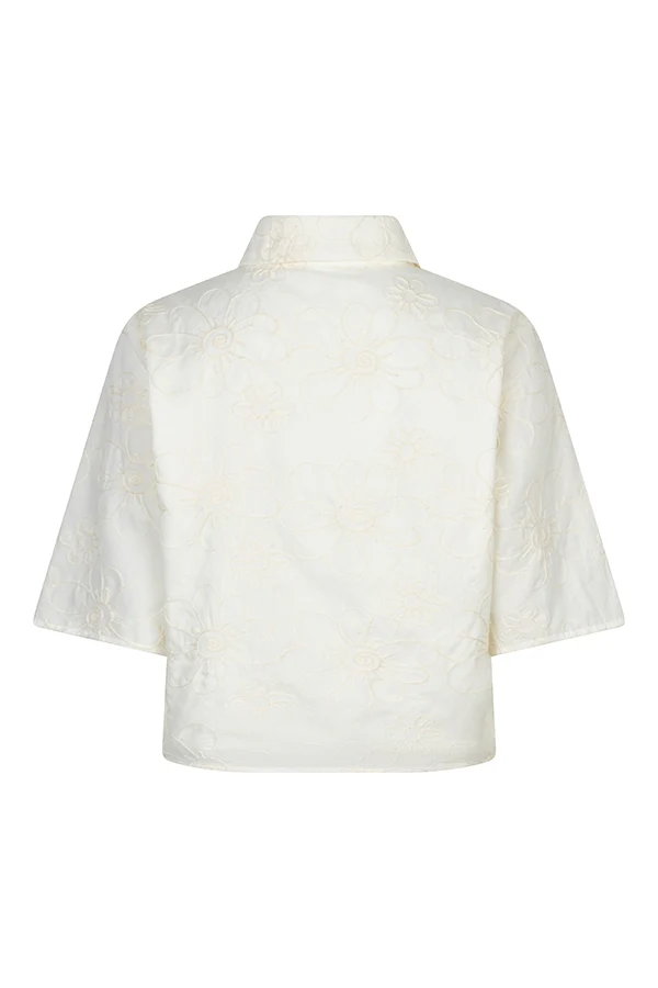Blouse Fae is een witte blouse met een licht cropped fit. De klassieke kraag en knopen aan de voorkant geven een tijdloze look. Het bloemdetail in de stof maakt deze blouse perfect voor lente en zomer.Materiaal: 80% Polyester, 20% Katoen