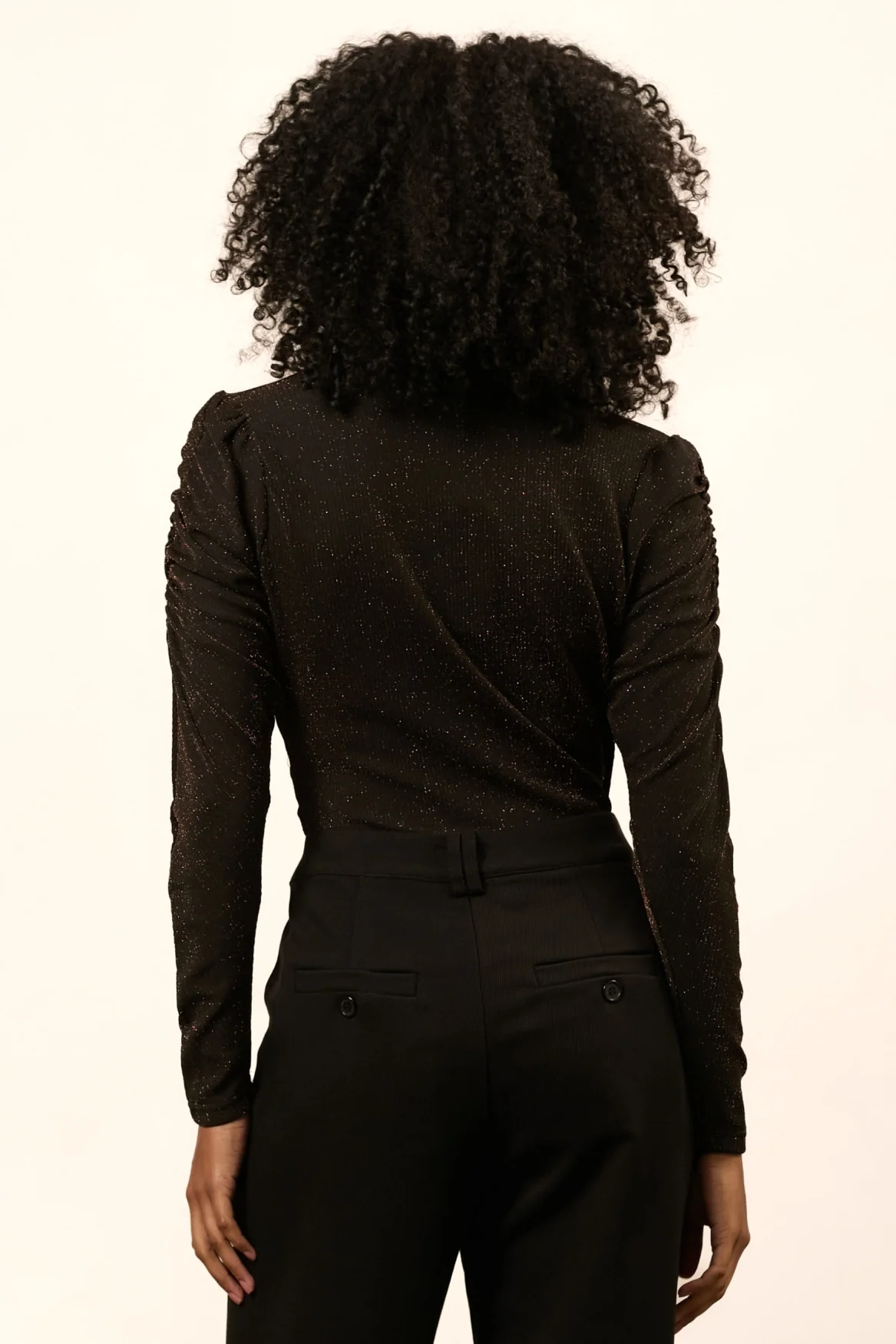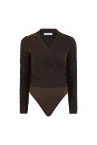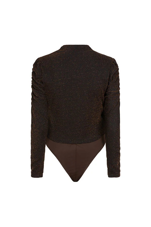 Body Everly is een aangesloten stringbody. De top heeft een V-hals, pofmouwen, wrapdetail en bevat een luxe glinstering dankzij de lurexdetails. De bruine body heeft een knoopsluiting en bevat veel stretch.