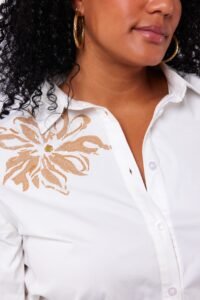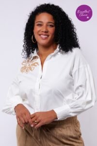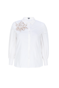 De Calista blouse combineert elegantie met comfort. Gemaakt van een zachte katoen-elastaanmix, biedt deze blouse een fijne pasvorm en subtiele stretch. Het geborduurde accent op de schouder zorgt voor een stijlvolle blikvanger, terwijl de pofmouwen en klassieke kraag de look compleet maken.
