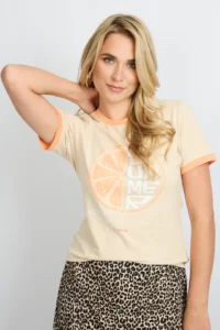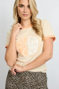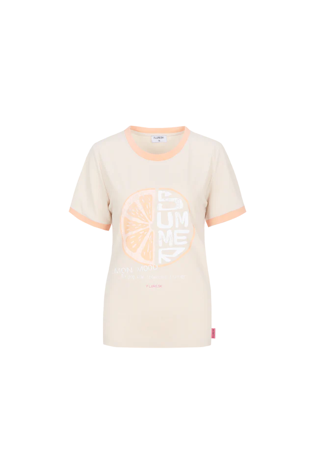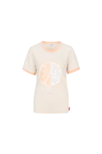 In the mood for lemon. De DAILYN T-SHIRT heeft een aangesloten fit, korte mouwen met contrasterende boorden en een frisse citrus print op de borst. De zachte stof voelt comfortabel aan en geeft je look een sporty, playful touch. De subtiele kleurcombinatie maakt ’m easy to style, maar toch opvallend. Combineer ’m met een printed rok voor een fun contrast of draag ’m casual met denim.Het model is 177 cm lang en draagt een maat 36. Dit item valt normaal. We raden je aan om jouw normale maat te nemen.100% Katoen