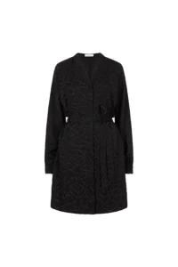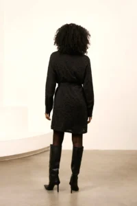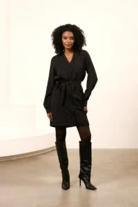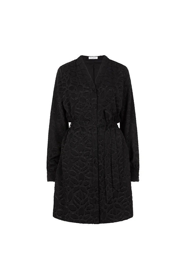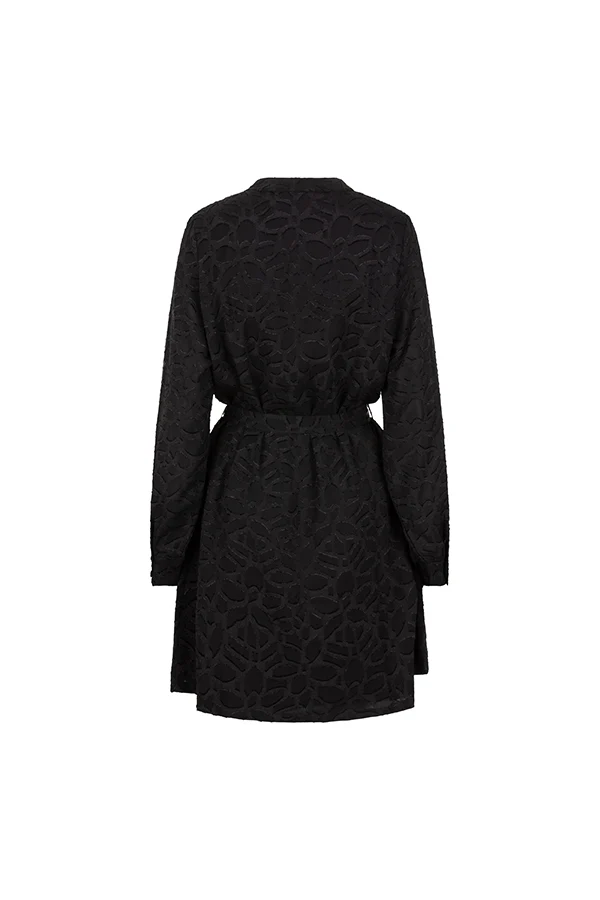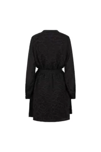 Jurk Lina is een zwarte jurk met patroon. De little black dress heeft een V-hals, afneembare riem en knoopjes bij de mouwuiteinden. De zwarte jurk heeft knoopjes over de gehele lengte en is gemaakt van een mooie geweven stof. De jurk is qua pasvorm rechtvallend.