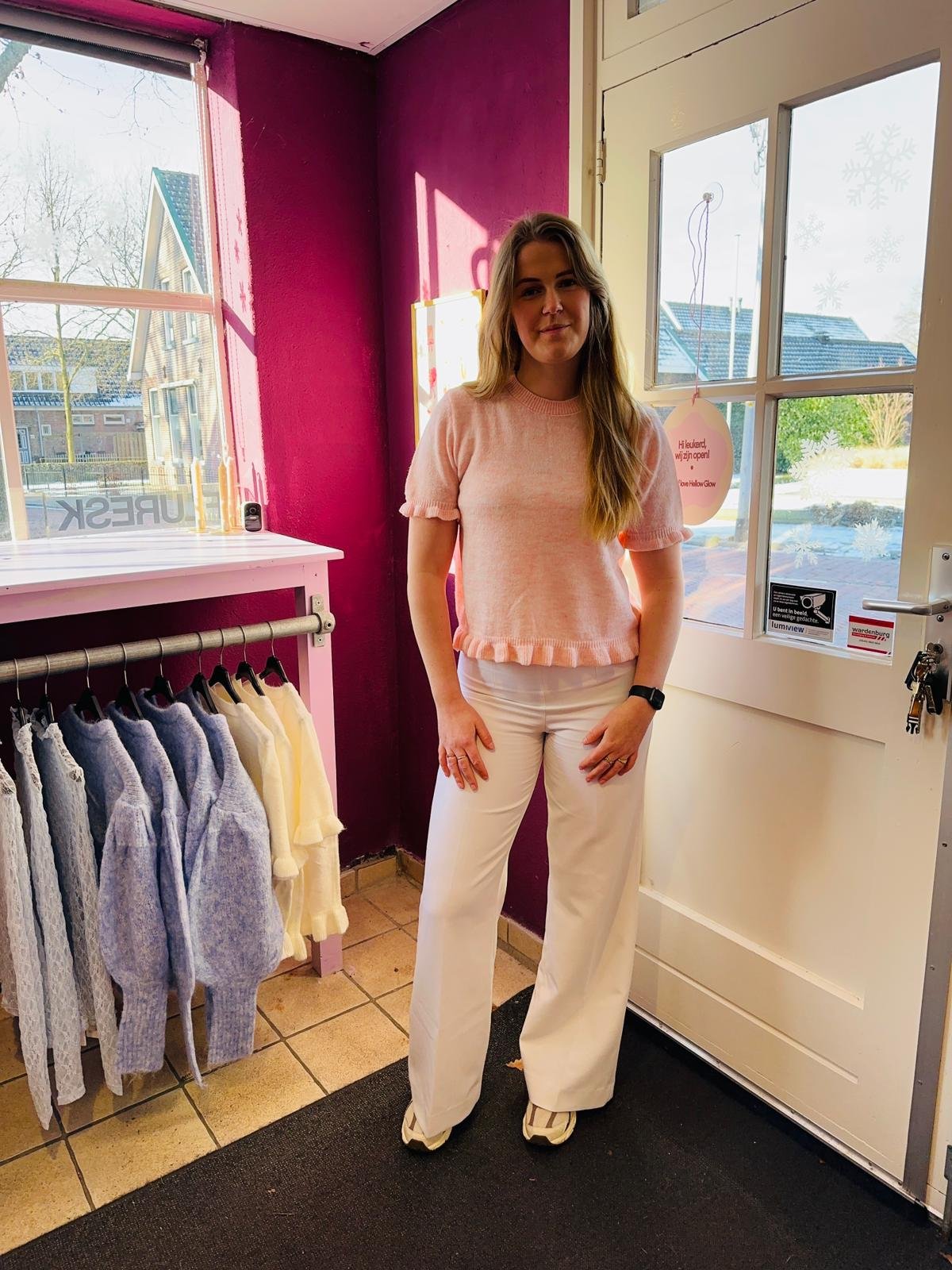 Deze stijlvolle gebreide top in de kleur licht roze is een echte must-have voor je garderobe. De speelse ruffles aan de korte mouwen en aan de onderkant geven de top een vrouwelijke en elegante uitstraling. Dankzij het zachte, comfortabele breisel is de top perfect voor zowel casual als geklede looks.