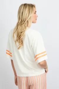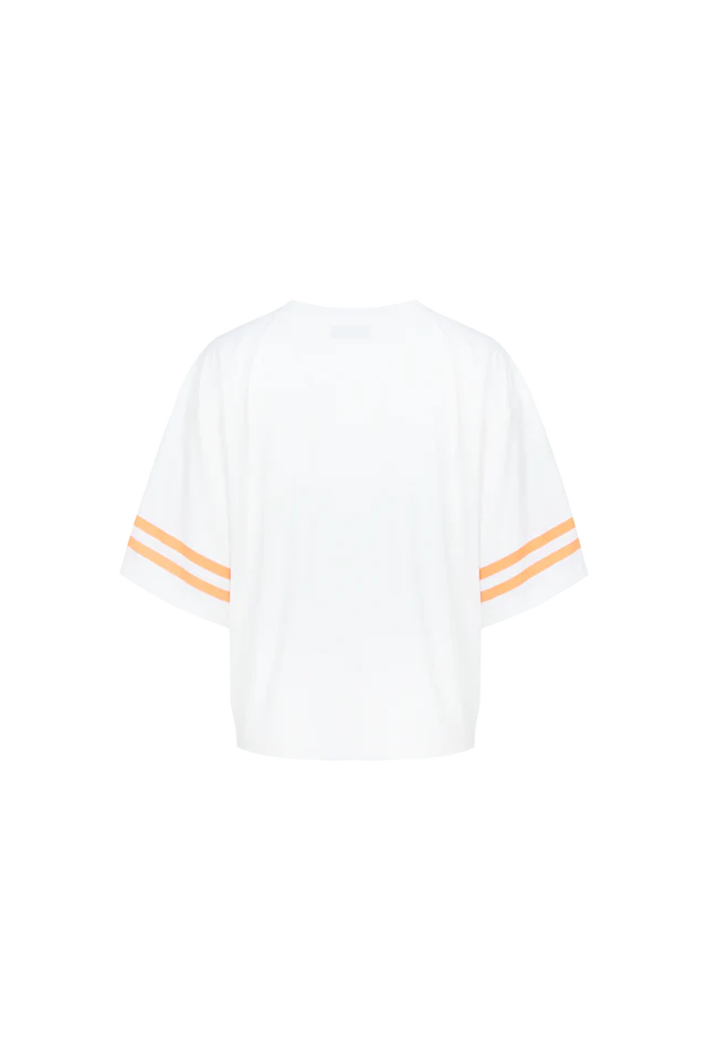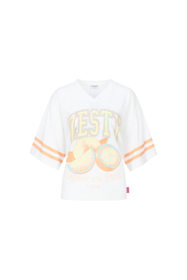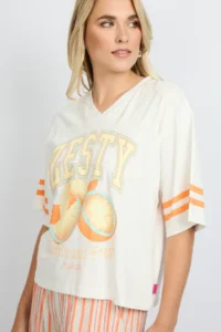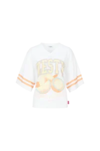 Sporty, fruity en full of fun. De YANELIS T-SHIRT heeft een relaxte fit, een V hals en een opvallende frontprint met citrus vibes. De strepen op de mouwen geven ’m een sporty touch, terwijl de zachte stof zorgt voor ultiem draagcomfort. Perfect voor een casual day look met denim of combineer ’m met een striped broek voor een speels geheel. Sweet, fresh and ready to zest up your outfit.Het model is 177 cm lang en draagt een maat 36. Dit item valt normaal. We raden je aan om jouw normale maat te nemen.100% Katoen